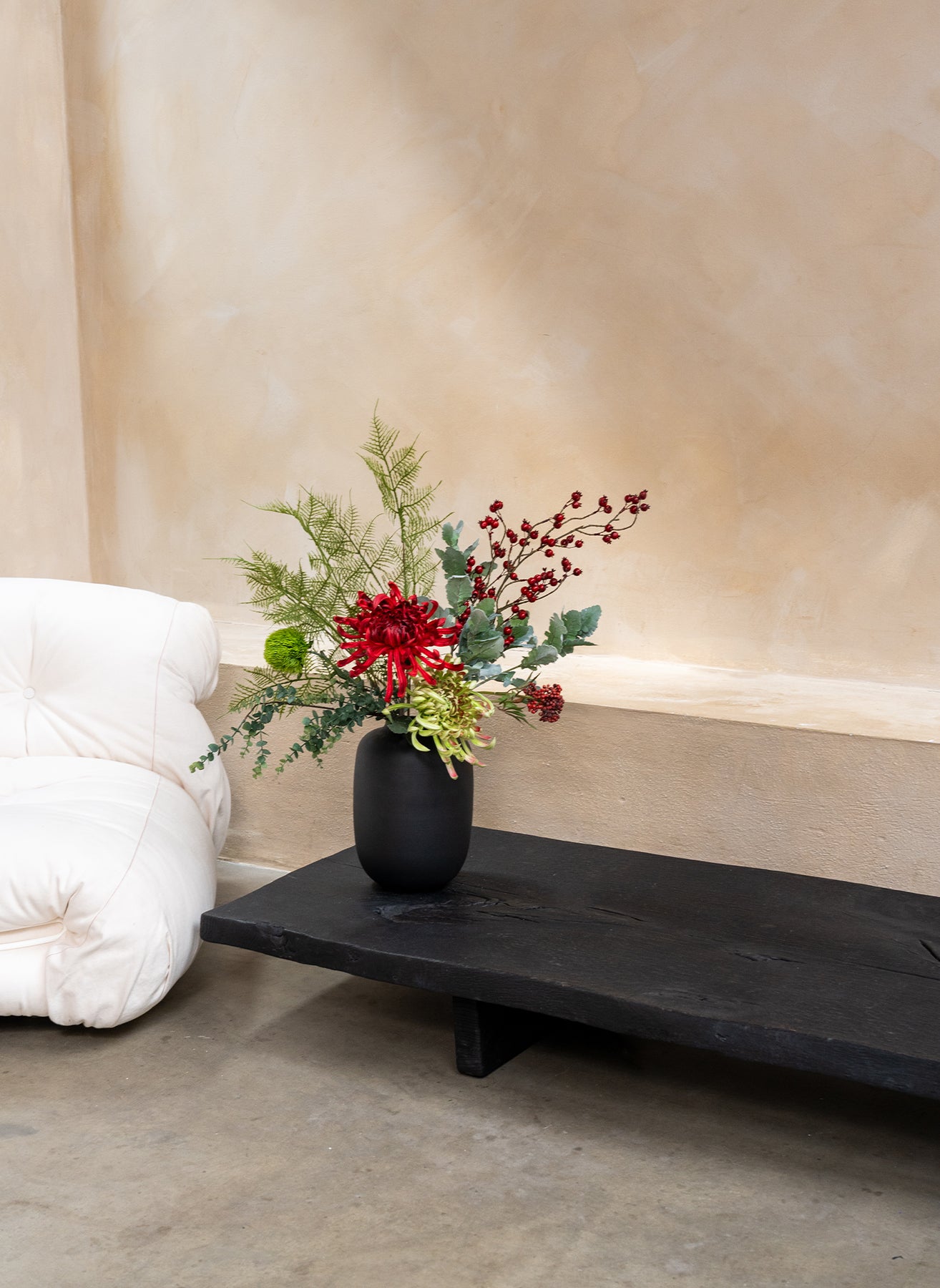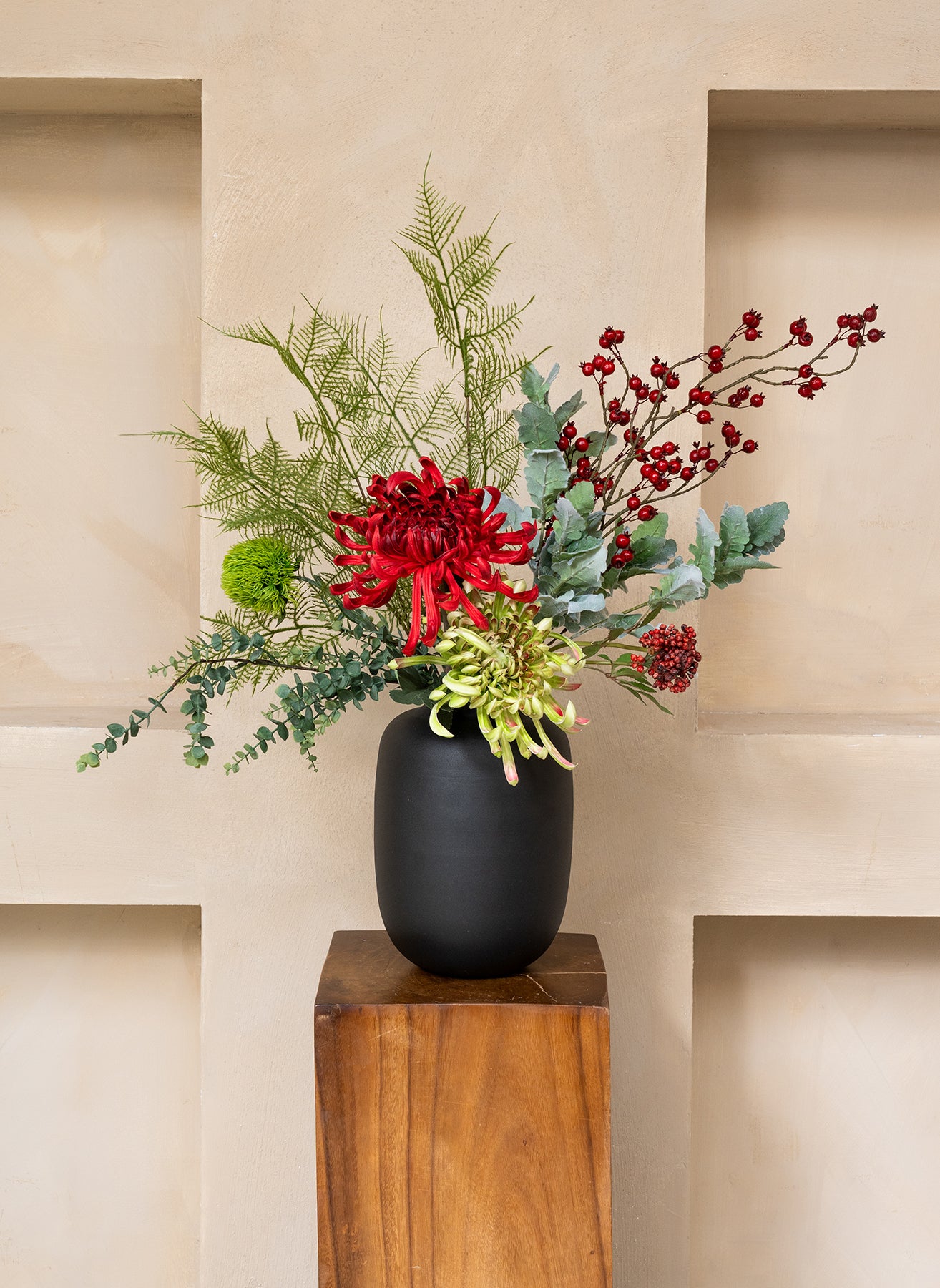 Ein festlicher Weihnachtsstrauß voller tiefroter Töne, Beeren und frischem Grün. Perfekt, um die Jahresendzeit stilvoll und luxuriös zu feiern.