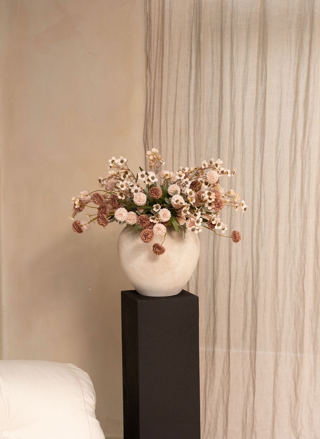 Die zarten Blüten der Wachsblumen schaffen eine luftige, sommerliche Atmosphäre, während die vollen Kiku-Blumen einen luxuriösen Akzent setzen. Zusammen bilden sie ein lebendiges und zeitloses Arrangement, das in jedem Interieur zur Geltung kommt.