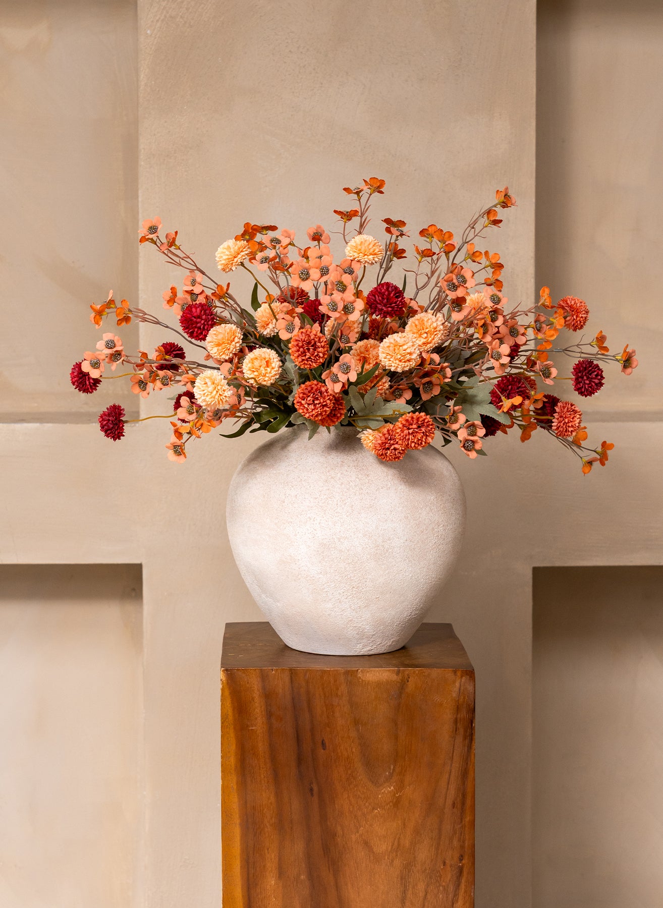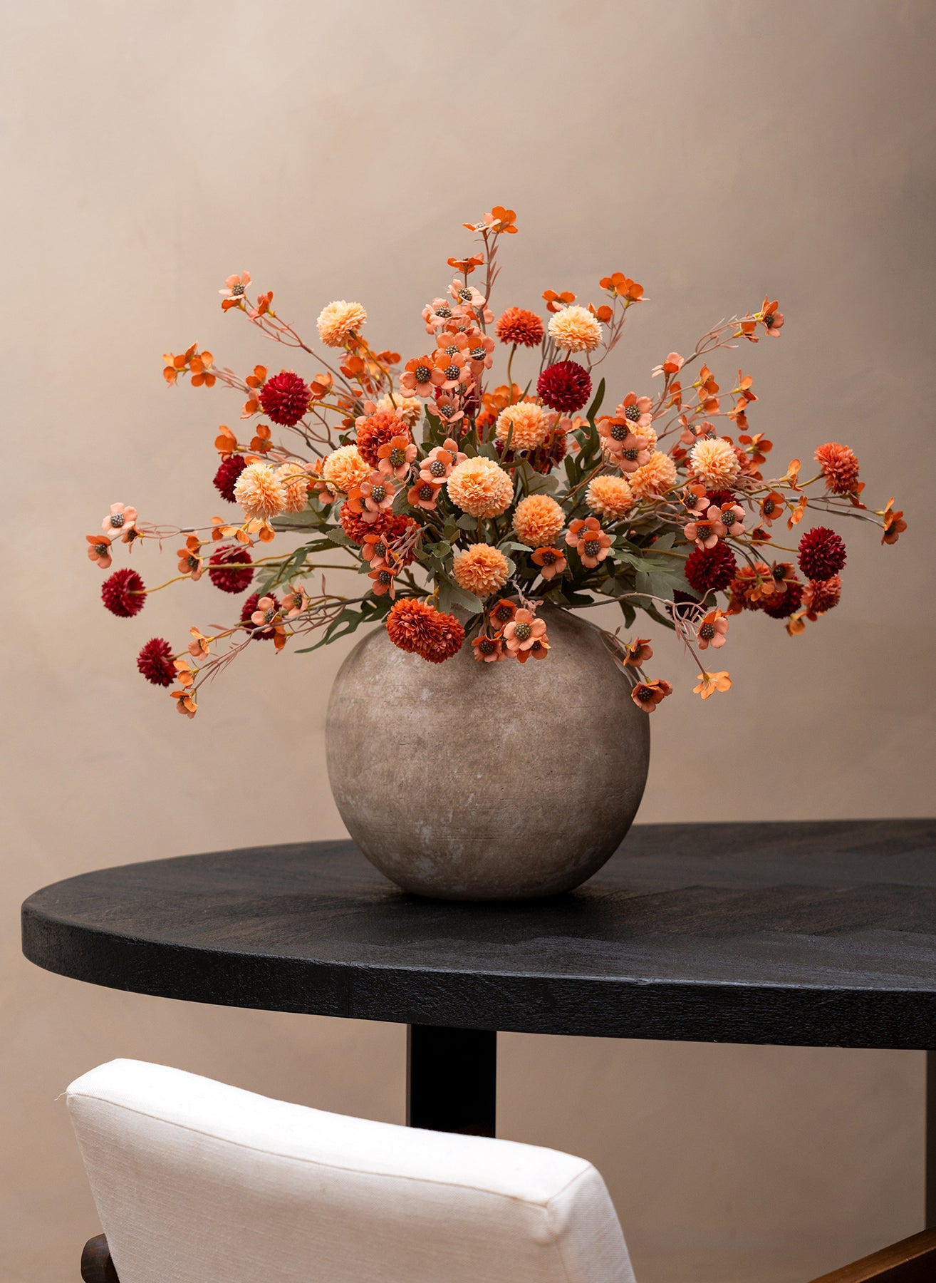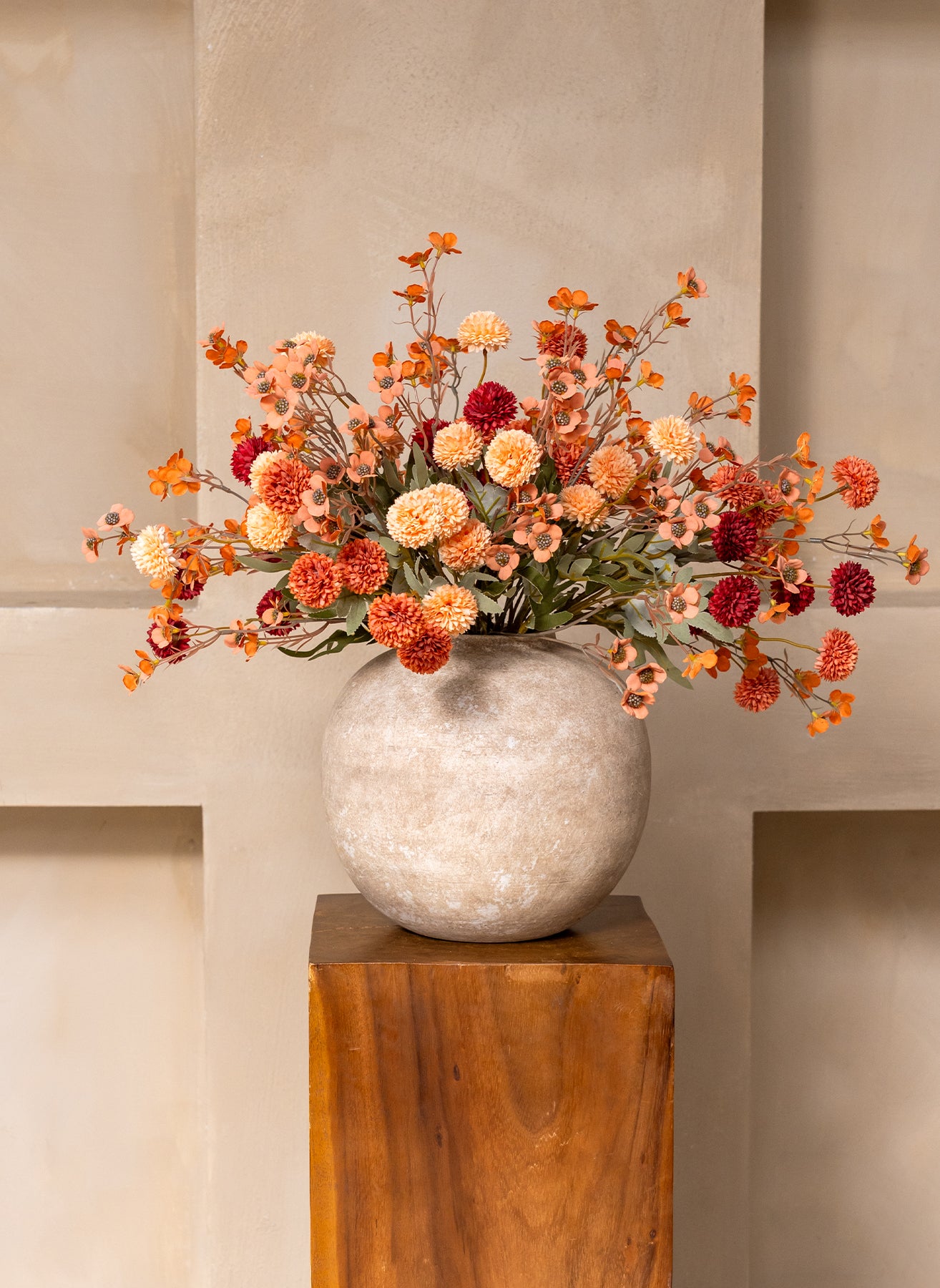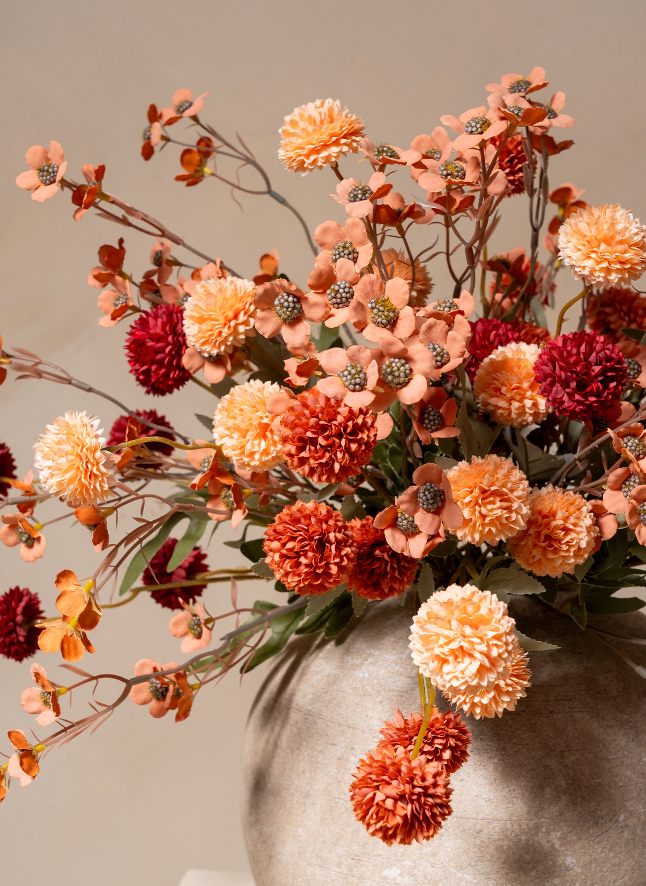 Die Kombination aus 10 Stielen Seidenwachsblumen und 10 Stielen Kiku-Blumen sorgt für ein harmonisches Gesamtbild mit Volumen, Farbe und einer natürlichen Ausstrahlung.