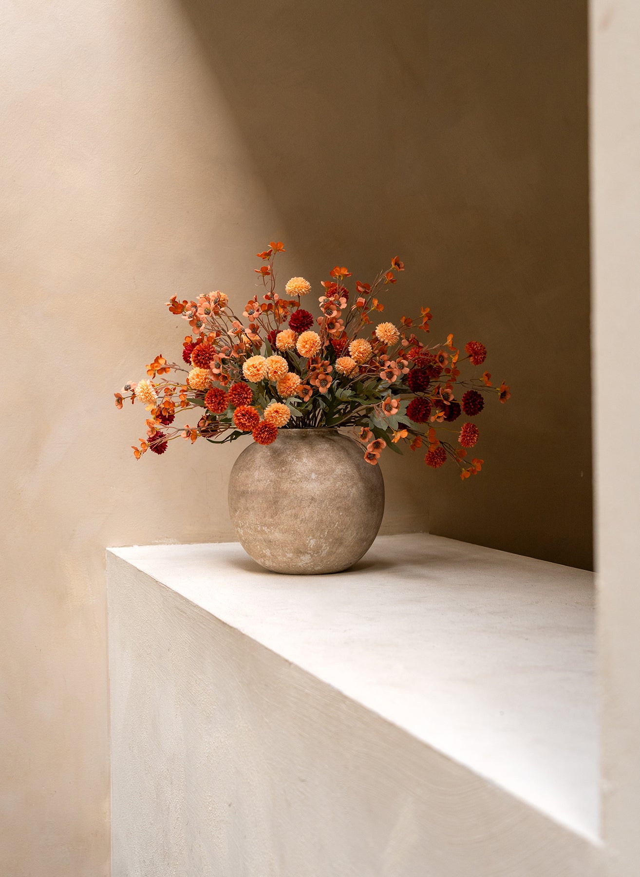 Unsere Kiku-Blumen bringen Tiefe und Farbe in dein Interieur und behalten das ganze Jahr über ihre perfekte Form – ohne Wasser, ohne Pflege.